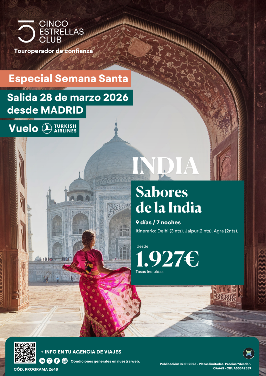 Cupos Semana Santa Sabores de la India PVP 1.927€ 9ds/7ns salida 28 marzo desde Madrid.