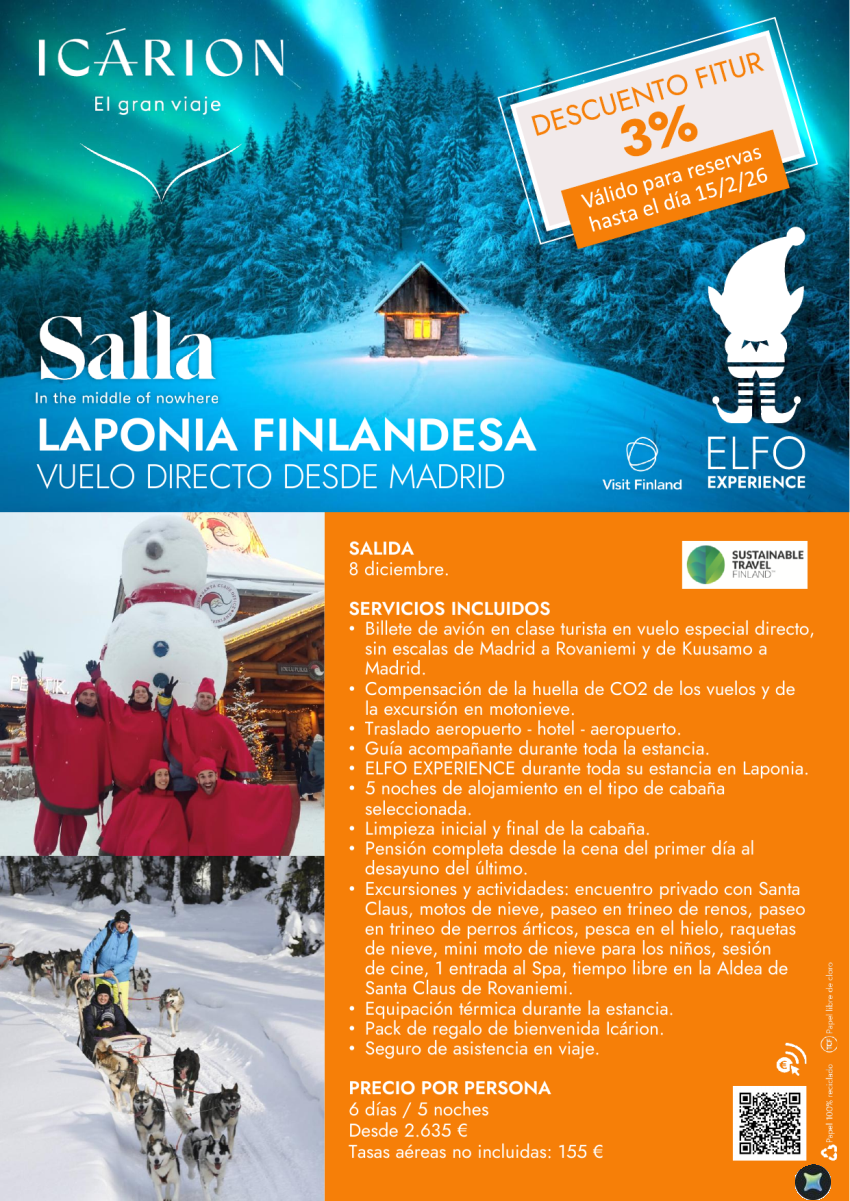 Salla. Laponia finlandesa. Descuento Fitur 3% válido hasta 15/02. Vuelo directo desde Madrid 8 diciembre