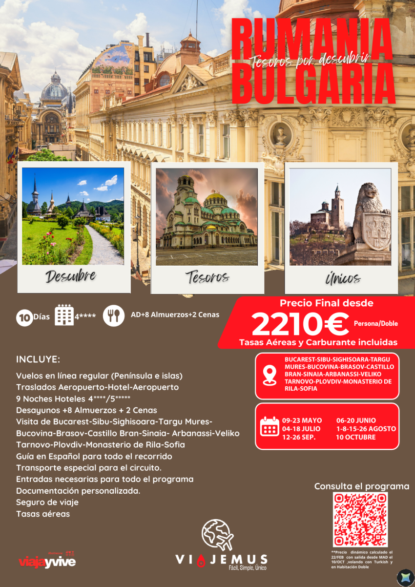 Rumanía y Bulgaría auténticos tesoros por descubrir. Un Tour de 10 días, hoteles 4*, 8 Almuerzos +2 Cenas